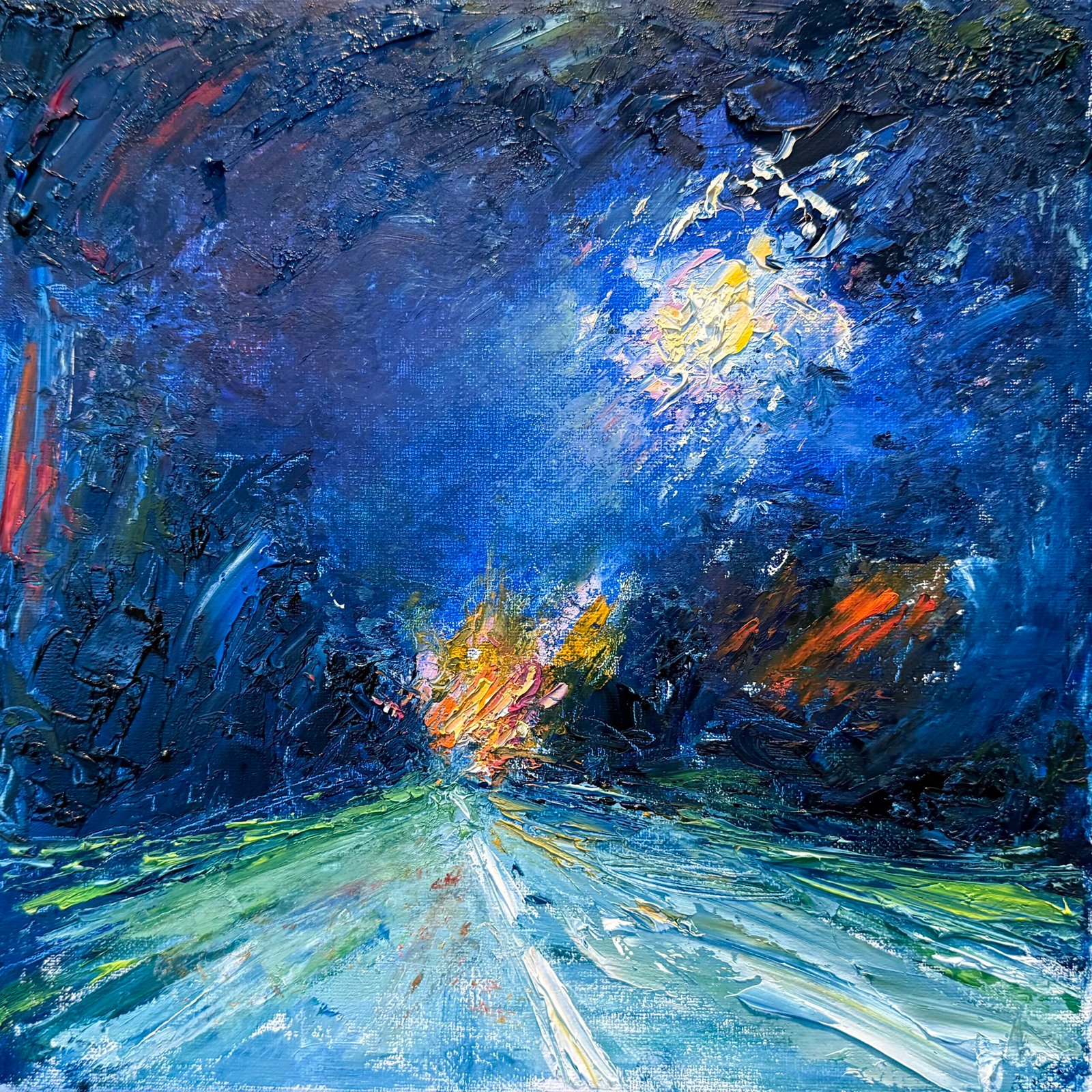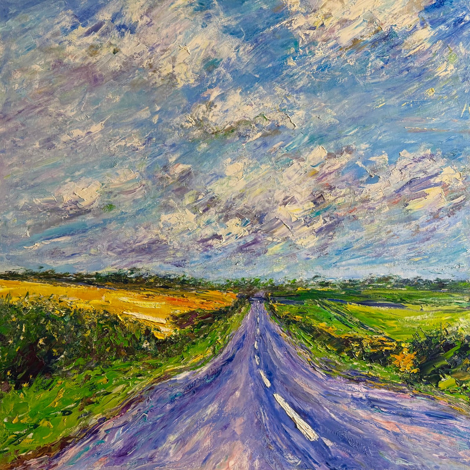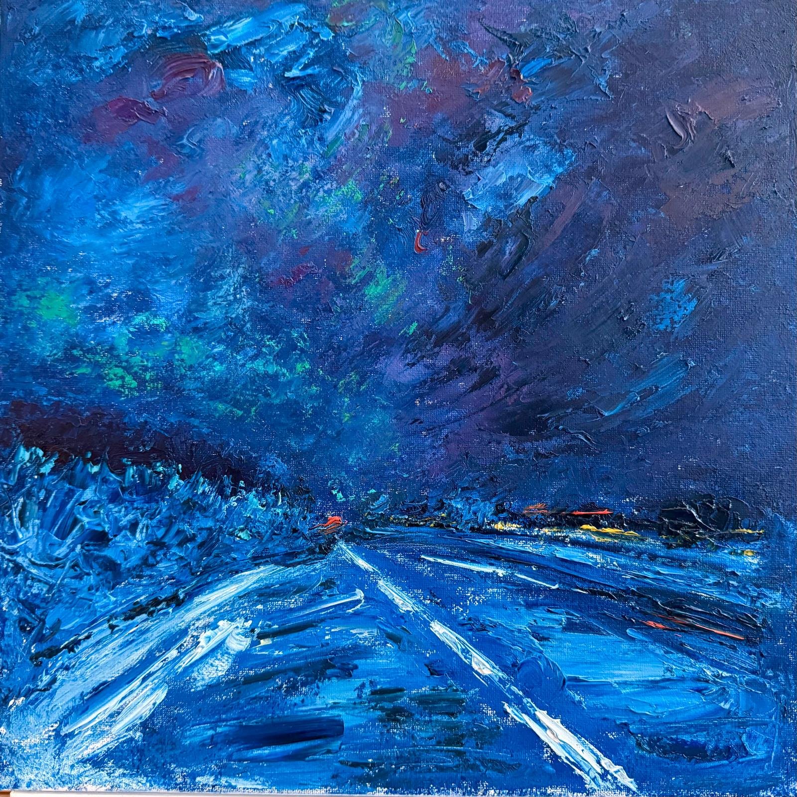 The road in these paintings is not merely a physical route. It is a state of mind. A moment suspended between “here” and “there,” between what has passed and what is yet to come. While driving, thoughts emerge. Memories, questions, and quiet reflections on direction, meaning, and the passage of time. The car becomes a temporary shelter, and the landscape beyond the windshield turns into a flowing projection of inner experience.